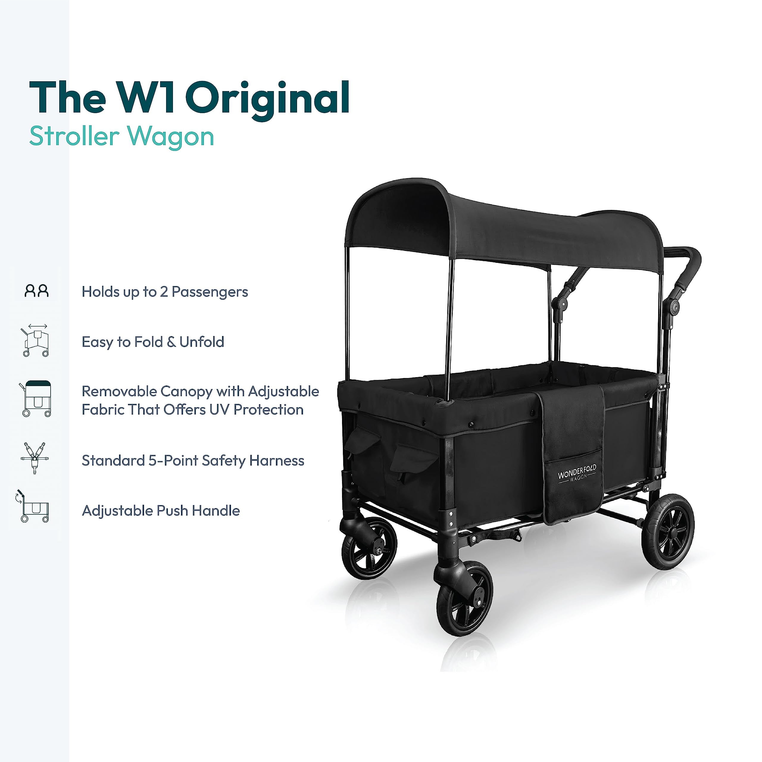 WONDERFOLD W1 Original Stroller Wagon (2 Seater) - Wagon Stroller with Seats with 5-Point Harnesses, Adjustable Push Handle, and Sun Canopy, Jet Black—