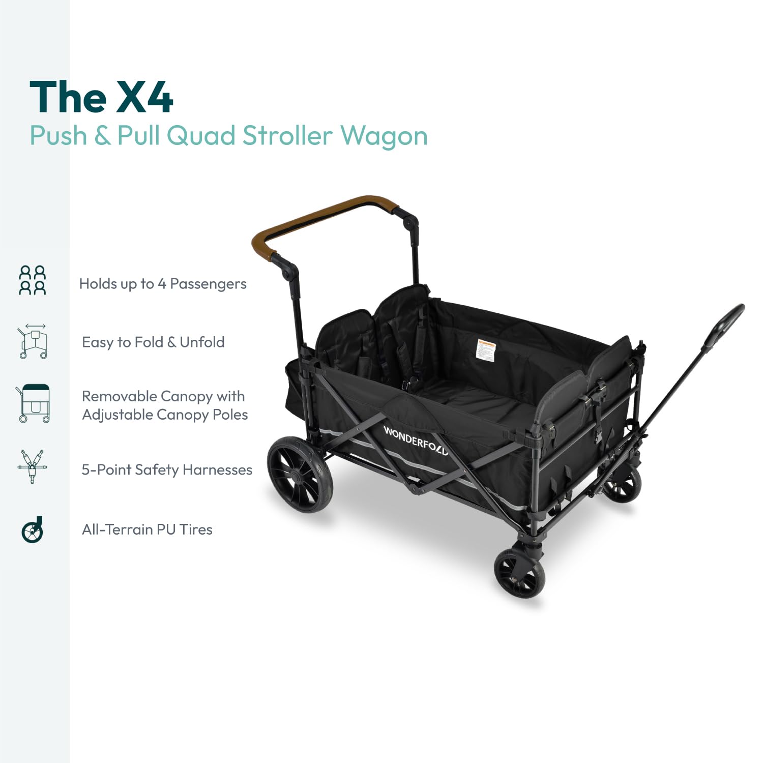 WONDERFOLD X4 Push & Pull Stroller Wagon (4 Seater) - Wagon Stroller with Seats with 5-Point Harnesses, Adjustable Push Handle, and Sun Canopy, Stealth Black